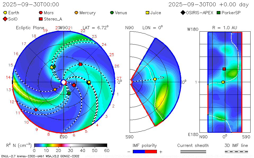 Hieronder ziet u de laatste voorspelling van de omstandigheden in de zonnewind, zoals voorspeld door het WSA-Enlil-model. De zonnewind is een snel bewegende stroom geladen deeltjes die van de zon komt en zich naar buiten beweegt, richting de aarde en de planeten. Onregelmatig komt het eens voor dat er een uitbarsting voorkomt. Variaties in de plasmadichtheid en snelheid binnen deze zonnestormen kunnen veel dramatischer zijn dan tijdens rustige omstandigheden. Deze kunnen leiden tot geomagnetische stormen.