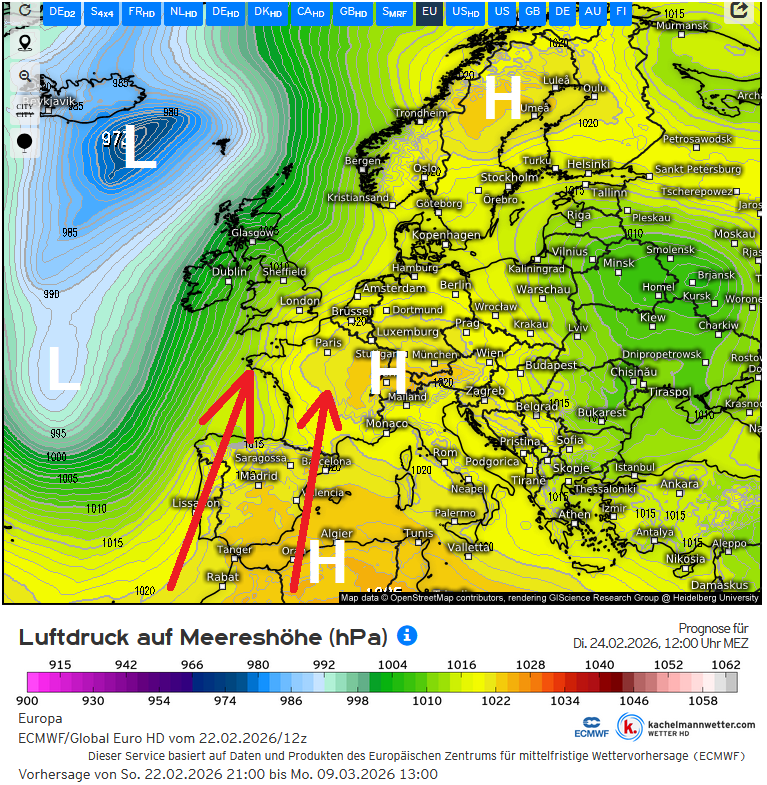 Een hogedrukgebied boven het zuiden van Europa trekt de komende dagen steeds meer richting het centrale gebied van Europa en tegelijk ontwikkelt er een nieuw hogedrukgebied boven Scandinavie. Een lagedrukgebied boven de Atlantische Oceaan beweegt zich met de hogedrukgebieden mee naar het noorden en hierdoor ontstaat er een zuidelijke aanvoer boven het westelijke deel van Europa met daarop warme lucht uit Afrika.